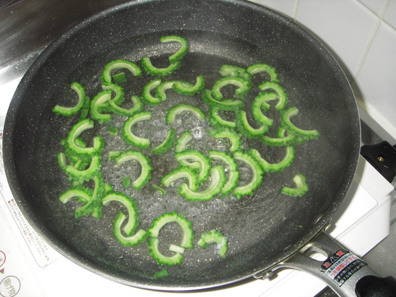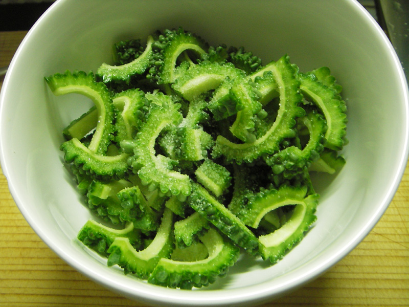 ネットで調べた知識によれば、ゴーヤーの苦さを抑えるには塩揉みしてお湯に通すべしと書いてあったので、